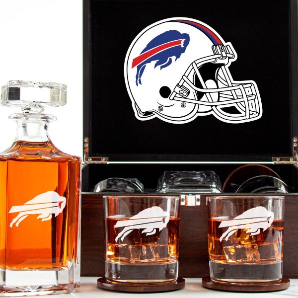 Customized Engraved Dark Brown Wood Box Decanter Set With Rocks Glasses - NFL Buffalo Bills