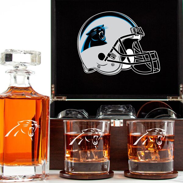 Customized Engraved Dark Brown Wood Box Decanter Set With Rocks Glasses - NFL Carolina Panthers