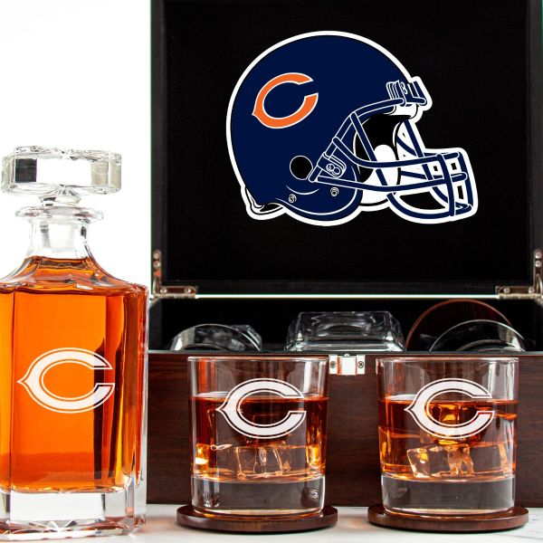 Customized Engraved Dark Brown Wood Box Decanter Set With Rocks Glasses - NFL Chicago Bears
