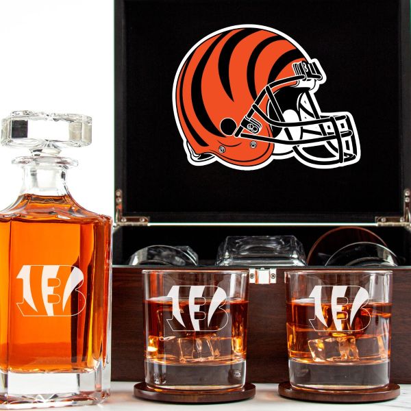 Customized Engraved Dark Brown Wood Box Decanter Set With Rocks Glasses - NFL Cincinnati Bengals