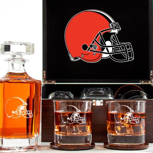 Customized Engraved Dark Brown Wood Box Decanter Set With Rocks Glasses - NFL Cleveland Browns