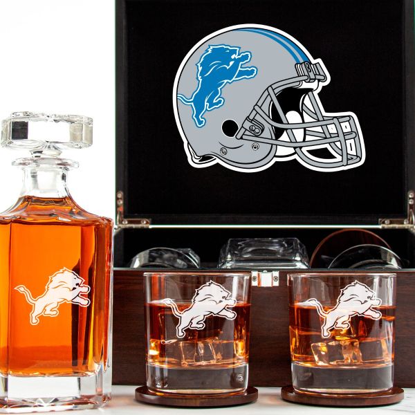 Customized Engraved Dark Brown Wood Box Decanter Set With Rocks Glasses - NFL Detroit Lions