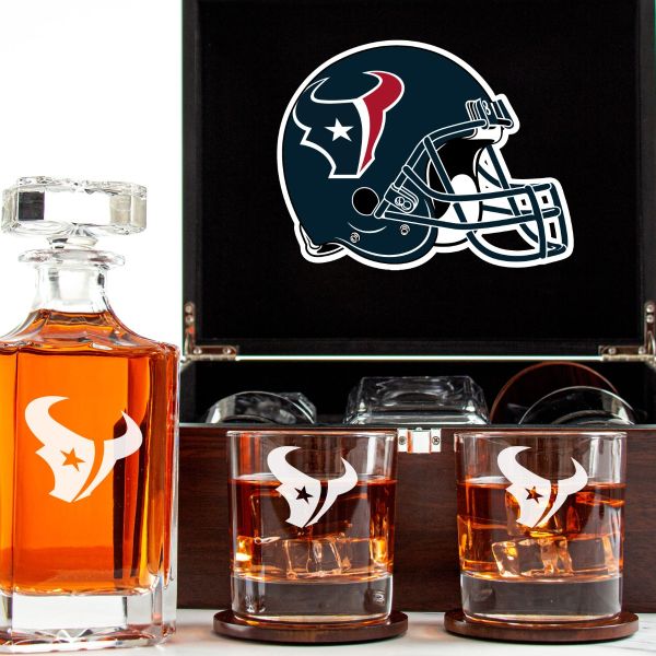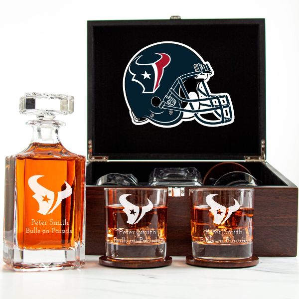 Customized Engraved Dark Brown Wood Box Decanter Set With Rocks Glasses - NFL Houston Texans