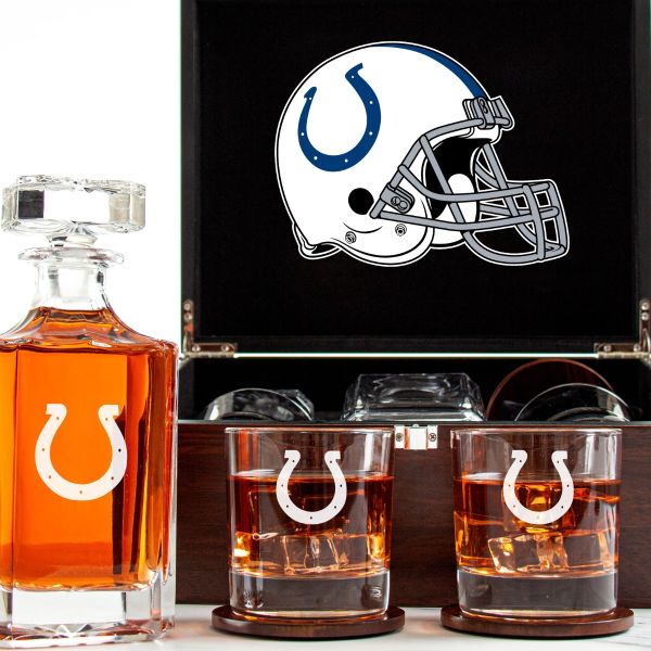 Customized Engraved Dark Brown Wood Box Decanter Set With Rocks Glasses - NFL Indianapolis Colts