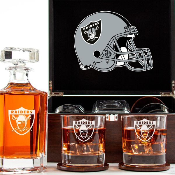Customized Engraved Dark Brown Wood Box Decanter Set With Rocks Glasses - NFL Las Vegas Raiders