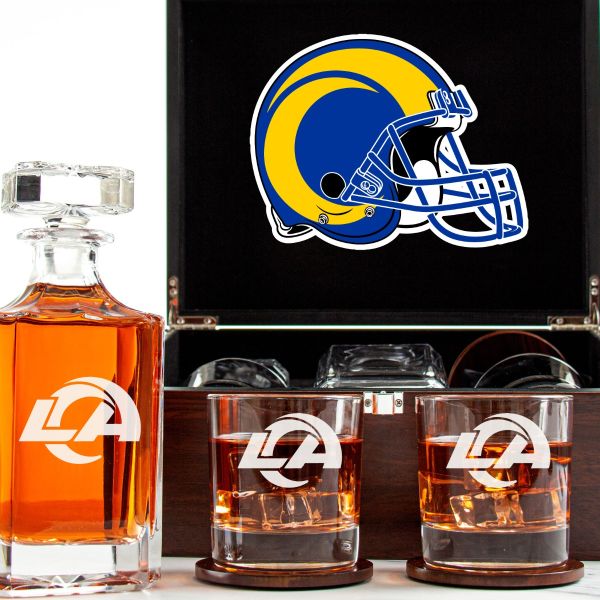 Customized Engraved Dark Brown Wood Box Decanter Set With Rocks Glasses - NFL Los Angeles Rams