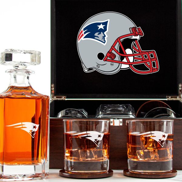 Customized Engraved Dark Brown Wood Box Decanter Set With Rocks Glasses - NFL New England Patriots