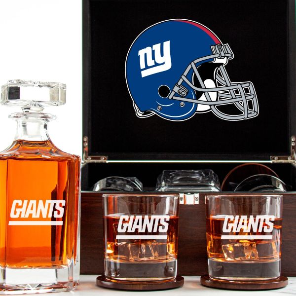 Customized Engraved Dark Brown Wood Box Decanter Set With Rocks Glasses - NFL New York Giants