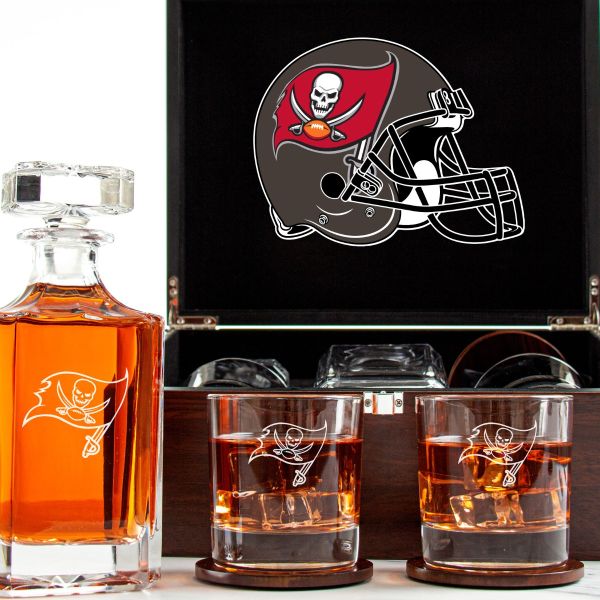 Customized Engraved Dark Brown Wood Box Decanter Set With Rocks Glasses - NFL Tampa Bay Buccaneers