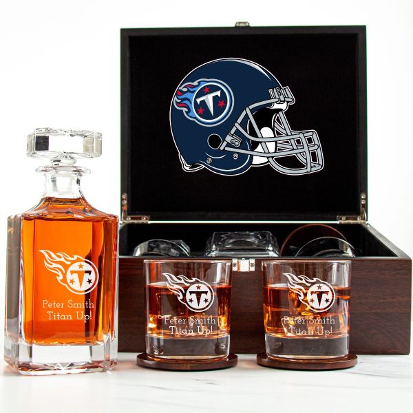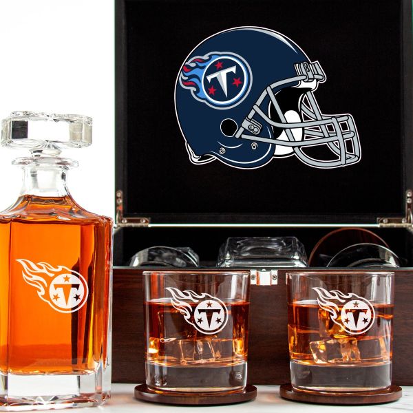 Customized Engraved Dark Brown Wood Box Decanter Set With Rocks Glasses - NFL Tennessee Titans