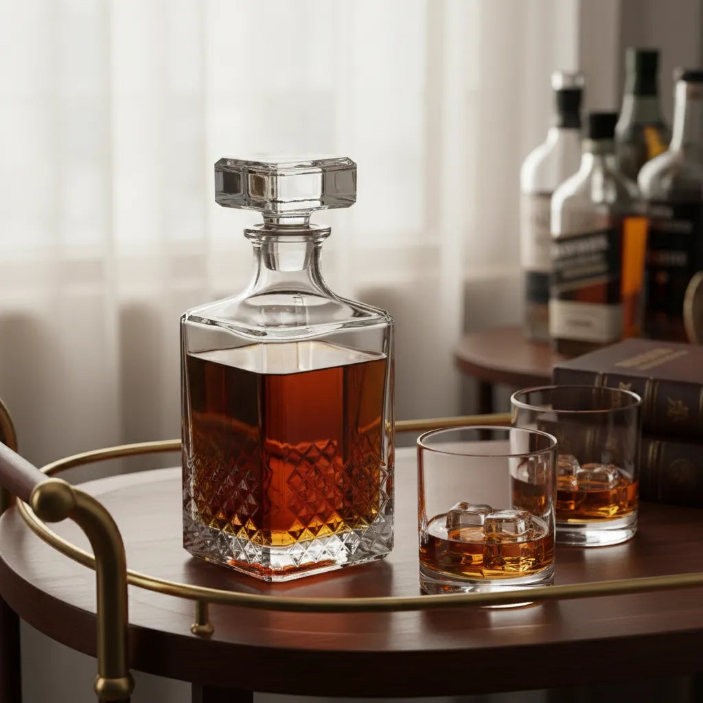 Decanter Brilliance: The star of the show, our Iceberg Decanter, boasts a generous capacity and a unique shape that allows your favorite spirits to breathe and develop their full flavor profile. Its crystal-clear clarity showcases the rich color and texture of your liquor, enhancing both the visual and aromatic aspects of your drinking experience.