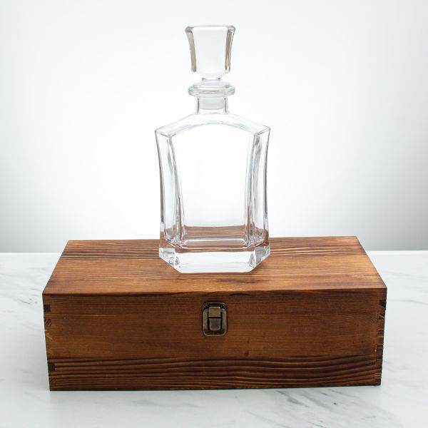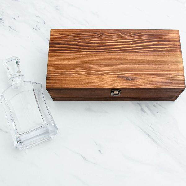 Glass Decanter - Durable and crystal-clear for showcasing your favorite spirits.Rustic Wood Box - Each box is unique, with natural imperfections and character that enhance its rustic appeal.