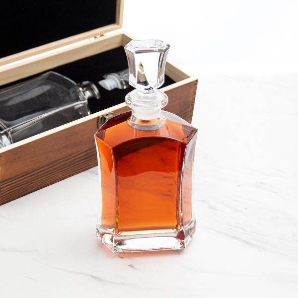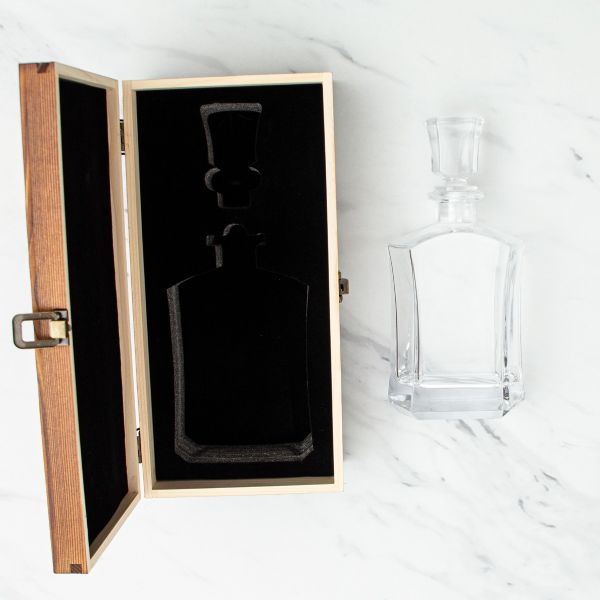 This decanter presented in a wood box offers a refined and luxurious packaging solution that elevates the overall experience. The rustic natural wood adds warmth and sophistication, making it perfect for corporate gifts, special occasions, or premium branding. The combination of glass and wood creates a timeless aesthetic that speaks to quality and craftsmanship.