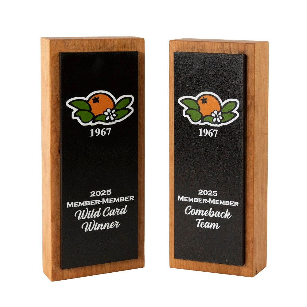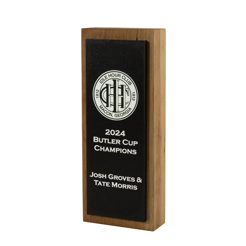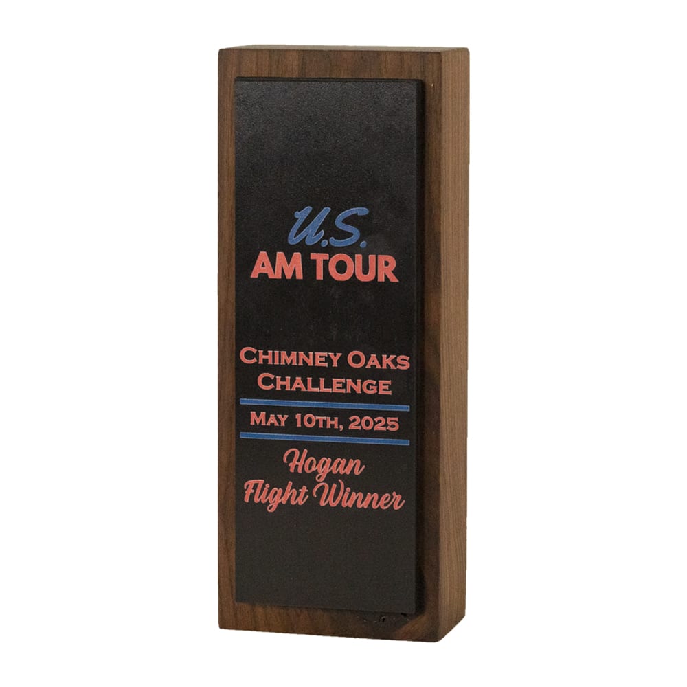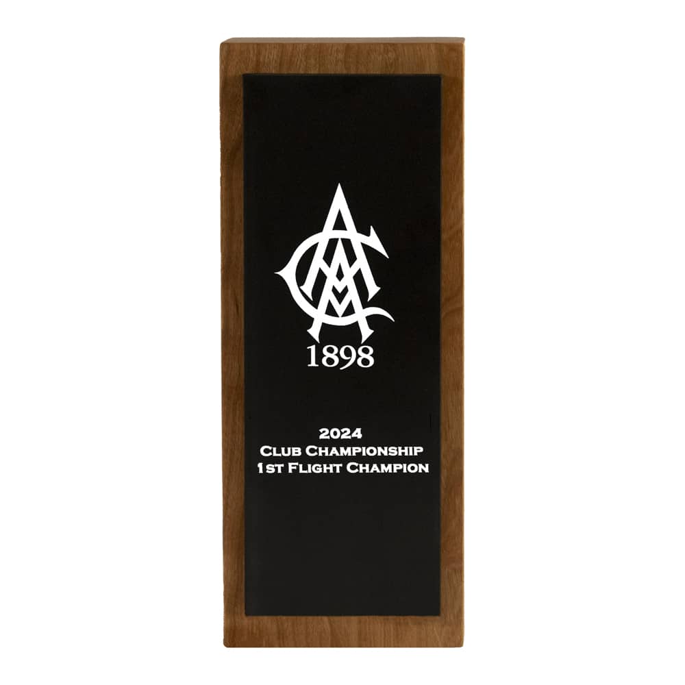 Celebrate excellence with the Links Champion Crest Award — a refined fusion of classic craftsmanship and modern design. Made from 2-inch thick cherry wood, this rectangular award showcases the natural beauty of hardwood, enhanced by a sleek black acrylic panel perfect for vibrant UV-printed customization.