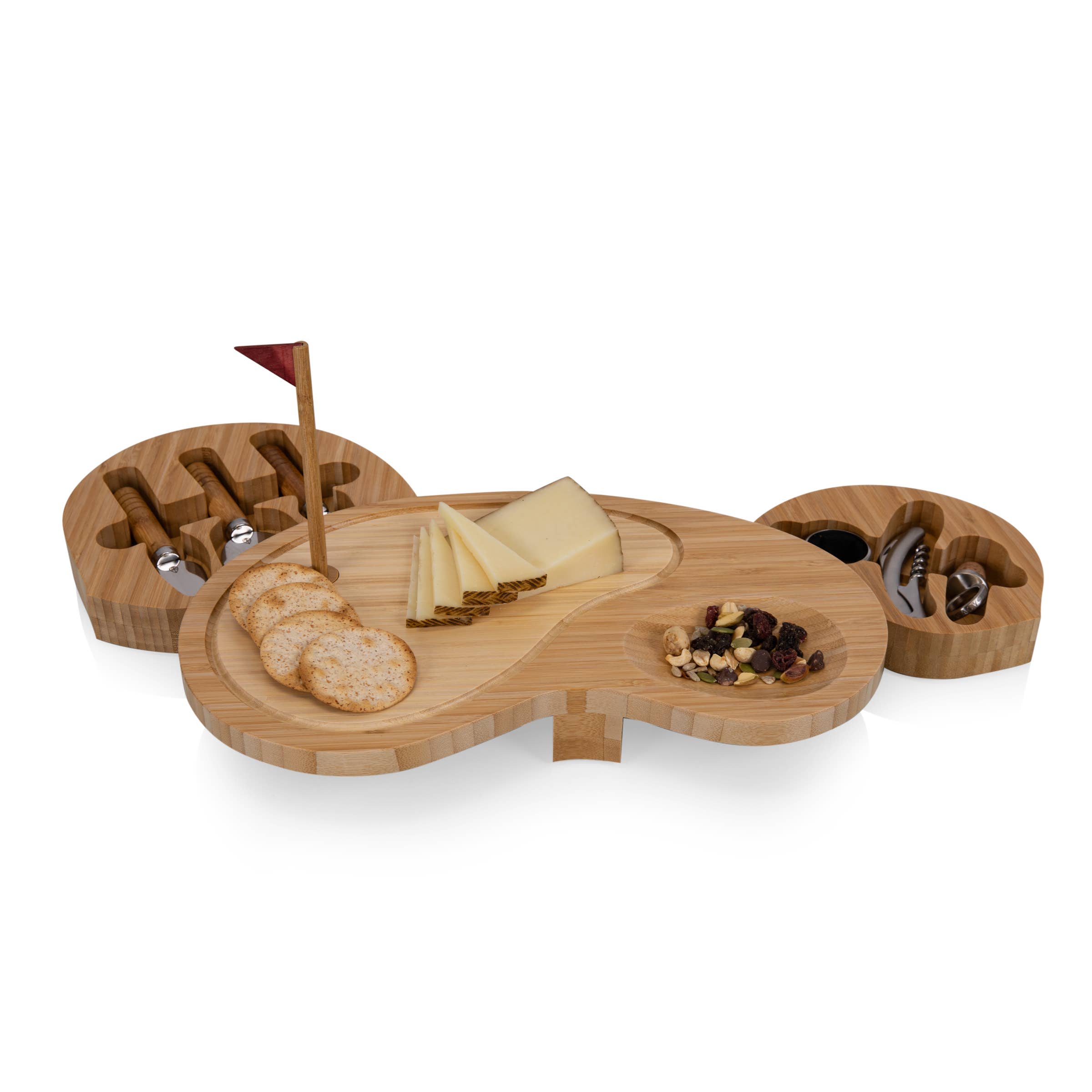 Perfect for the "19th Hole," the Sand Trap Cheese Board is a unique, golf-inspired cheese cutting board set made from rich bamboo and featuring two hidden swing-out drawers containing six stainless steel wine & cheese tools with bamboo handles: one crumbly cheese chisel knife, one hard cheese knife, one cheese fork, one waiter-style corkscrew, one knob-style bottle stopper, and one drip ring. Accents like the recessed juice groove surrounding the green, a carved-out "sand trap" for holding olives or tapenades, and a cute removable pin/flag pole held in place by a magnet makes this the ultimate gift for the golfer in your life. Fore!