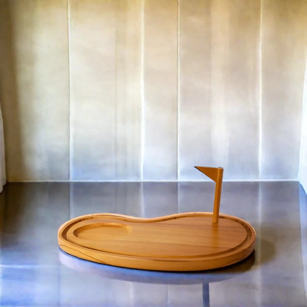 • Design: Shaped like a putting green with recessed sand trap and removable flag pole