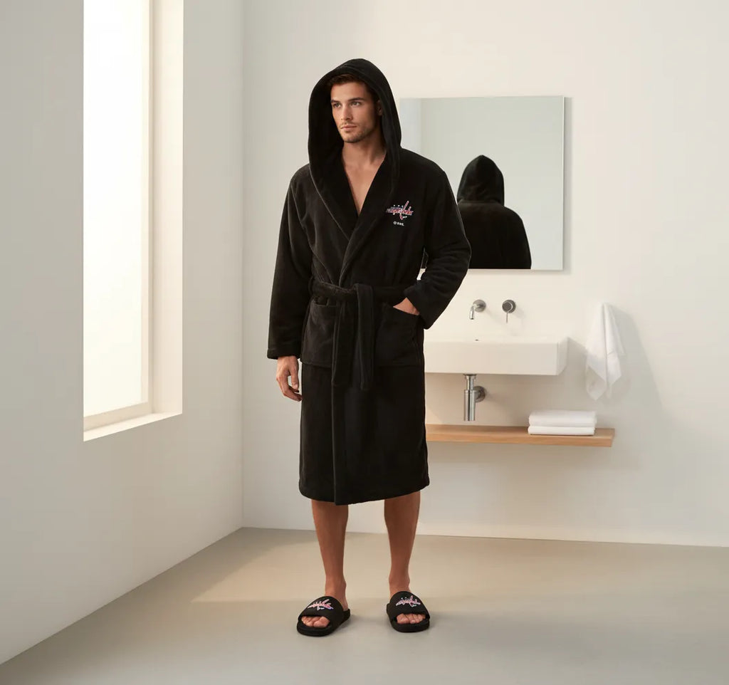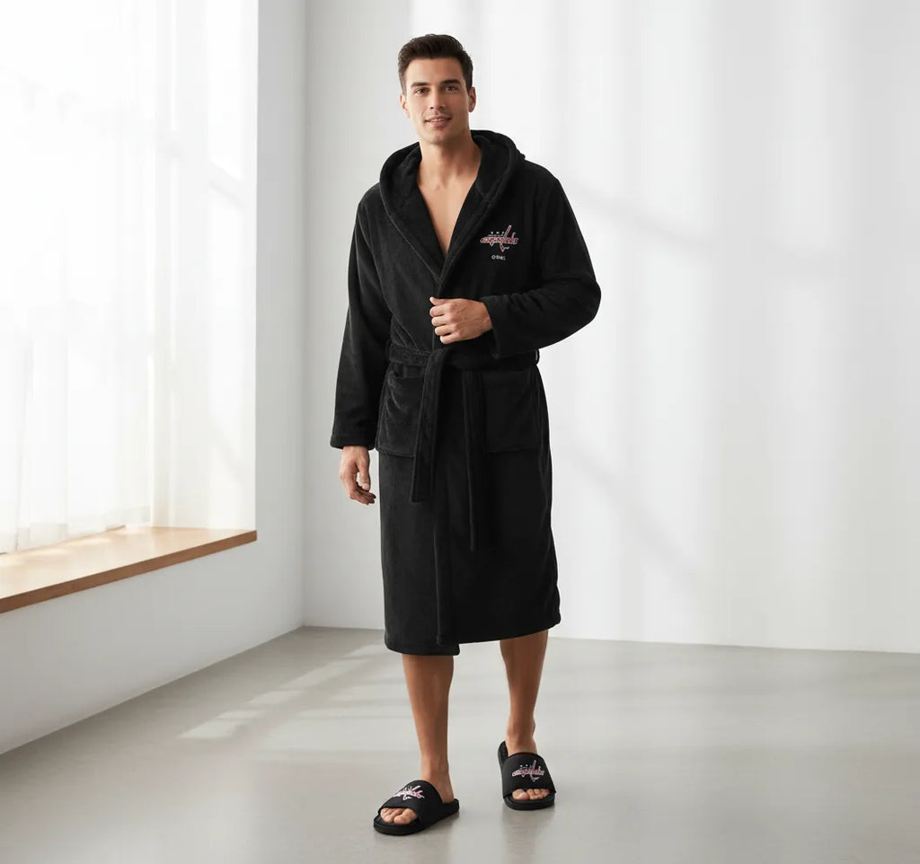 Drop the puck on ultimate comfort with the Washington Capitals Phantom Robe Slide Bundle. This all-black “Phantom” edition is built for Capital loyalists who want to rep the red, white, and blue without screaming it—until the screaming starts in the third period.
