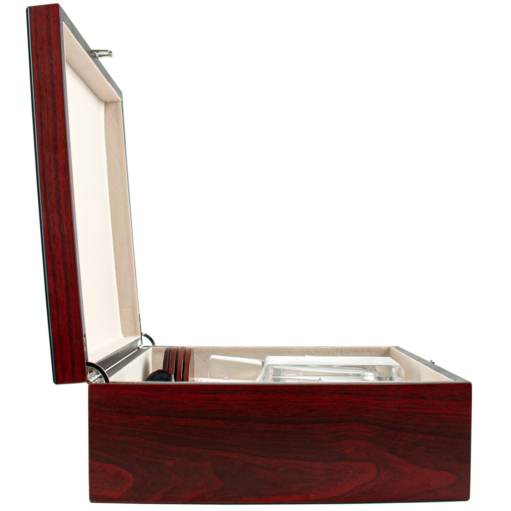 Delight your guests with this sophisticated cherry wood decanter gift box set. The wooden box is crafted with intricate carvings and comes with two exquisite rocks glasses, making it ideal for serving a variety of drinks in classic, timeless fashion. Elevate your bar with this luxurious set that celebrates an appreciation of the finer things.